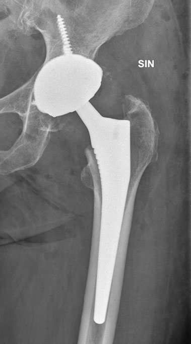The patient was afebrile with normal laboratory findings except for a slightly elevated alkaline phosphatase. Arthrocentesis showed a nonviscous fluid with a normal leukocyte count with only 30% polymorphonuclear leukocytes. Infectious etiology was further excluded by negative bacterial cultures both in the joint aspirate obtained preoperatively and peroperatively by multiple biopsies. The patient was successfully operated with a single-stage total hip arthroplasty and recovered without any complications (Figure 3). The diagnosis of rapid destructive osteoarthritis was made after clinical exclusion of other causes of destructive arthropathy.