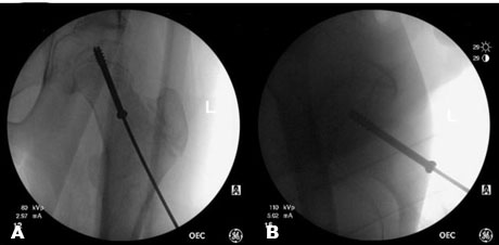 On hospital day two the patient was taken to the operating room for open treatment of the left SCFE with in situ screw fixation. Prior to surgery a discussion was had regarding use of a Femoral Neck System for fixation; however, given the large slip angle, fixation with cannulated screws was decided upon. A single 60 mm × 7.3 mm cannulated screw was used for fixation and its placement confirmed on multiple intra-operative fluoroscopic images (Figure 2A and Figure 2B). The patient’s post-operative course was uncomplicated and he was discharged home on post-op day one with home physical therapy. He was made partial weight bearing on the left lower extremity for four weeks before transitioning to full weight bearing. The patient was highly recommended to follow up with his endocrinologist for continued management of his hypopituitarism as well as for monitoring of his overall bone health.
