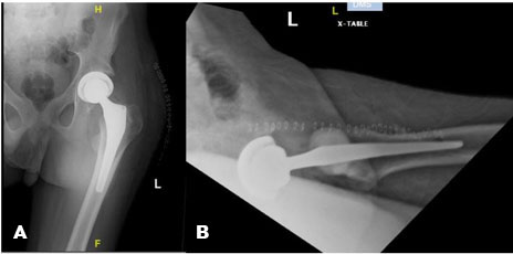 He returned to the operating room on hospital day three of his second admission for conversion of the prior left hip surgery to an uncemented total hip arthroplasty (Figure 4A and Figure 4B). He tolerated the procedure well and there were no complications. His post-op course was uneventful, and he was discharged home and stable condition on post-op day two. He was made full weight bearing on the left lower extremity immediately after surgery without issues.